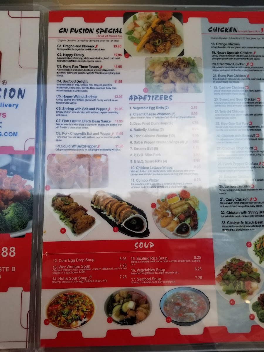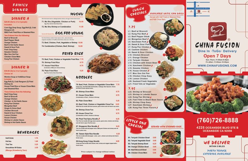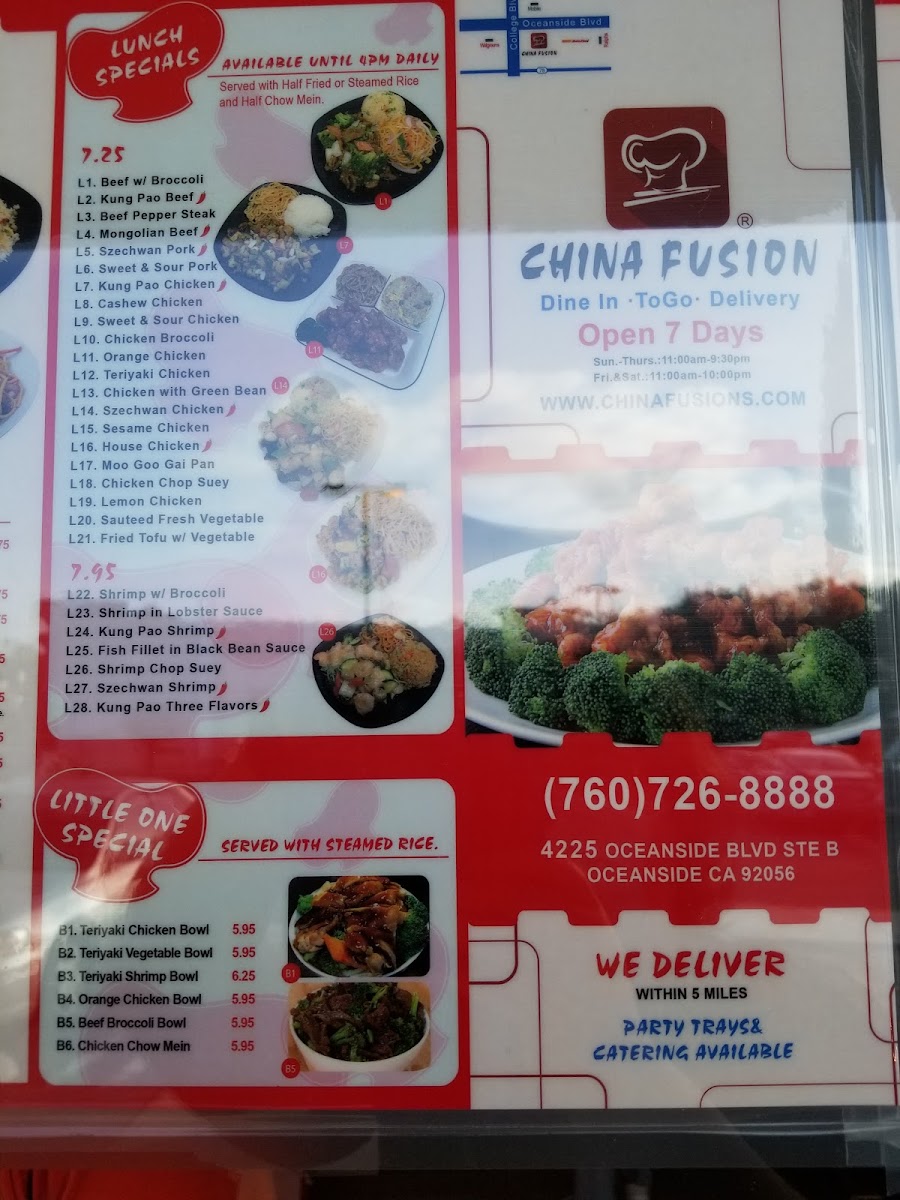 Welcome to China Fusion Restaurant, where authentic Chinese flavors meet a modern twist. Located at 4225 Oceanside Blvd in Oceanside, CA, this gem offers a diverse menu catering to all tastes. The chef's specials are a highlight, with dishes like the C1 Dragon & Phoenix Shrimp and C2 Happy Family showcasing fresh ingredients and bold flavors. Guests rave about generous portions, made fresh in large woks—ensuring every meal bursts with flavor.